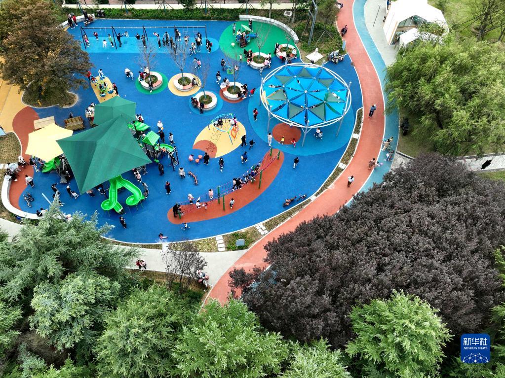 10月6日,青少年在山東青島西海岸新區雙珠公園游樂(lè )場(chǎng)玩耍(無(wú)人機照片)。