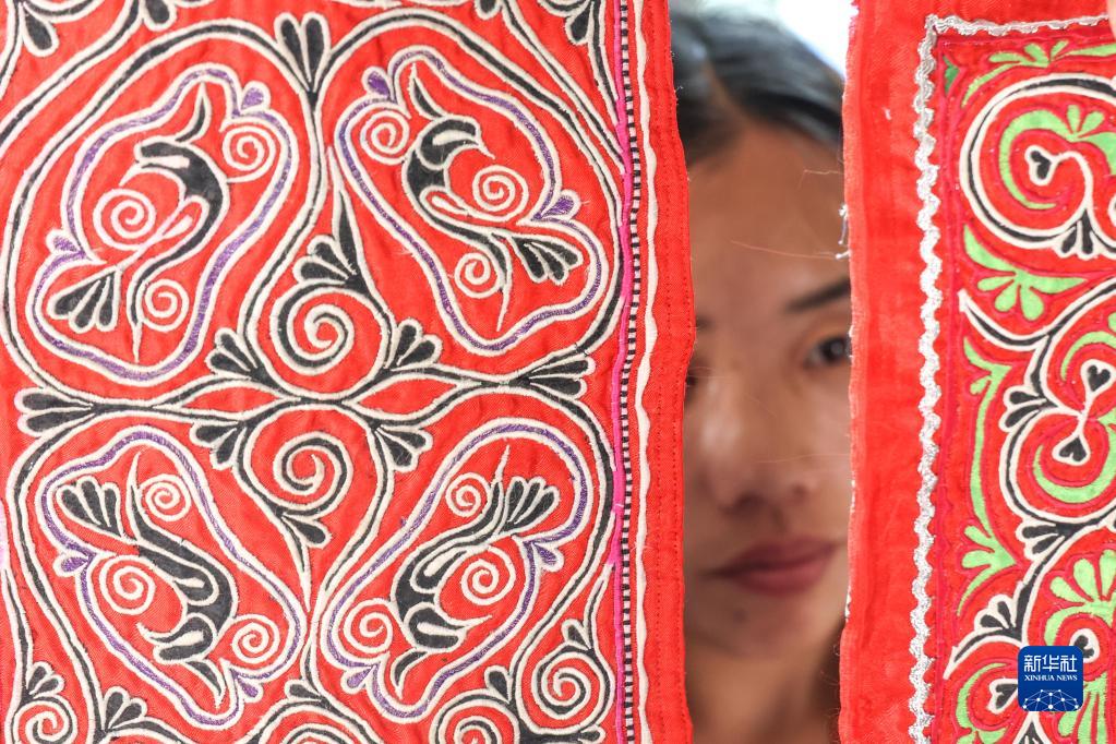 村民在貴州省黔西市新仁苗族鄉化屋村刺繡車(chē)間內查看苗繡成品(2022年6月1日攝)。新華社記者 歐東衢 攝