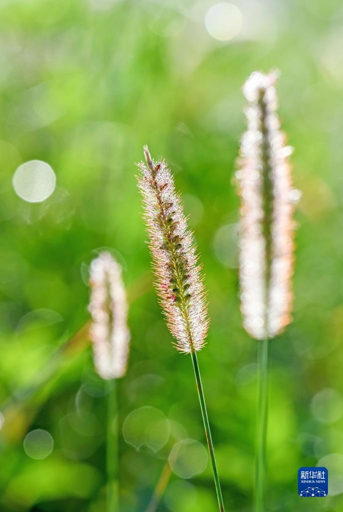 在廣西南寧市邕寧區,狗尾草上掛滿(mǎn)露珠(10月4日攝)。