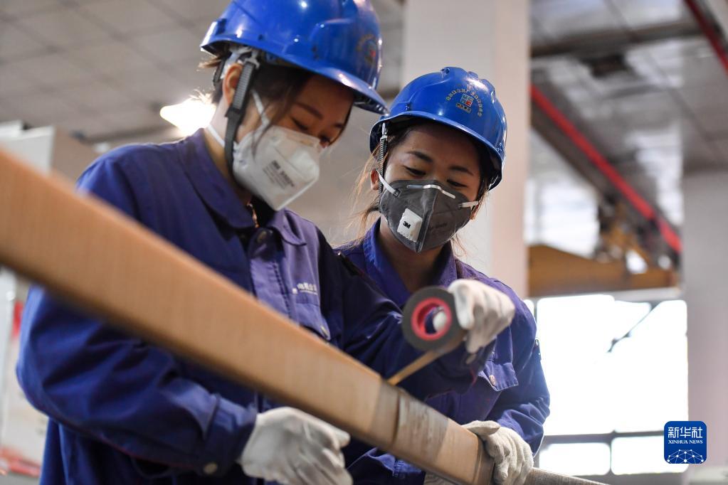 10月6日,在哈電集團哈爾濱電機廠(chǎng)有限責任公司的生產(chǎn)車(chē)間,楊萌(右)與同事配合作業(yè)。