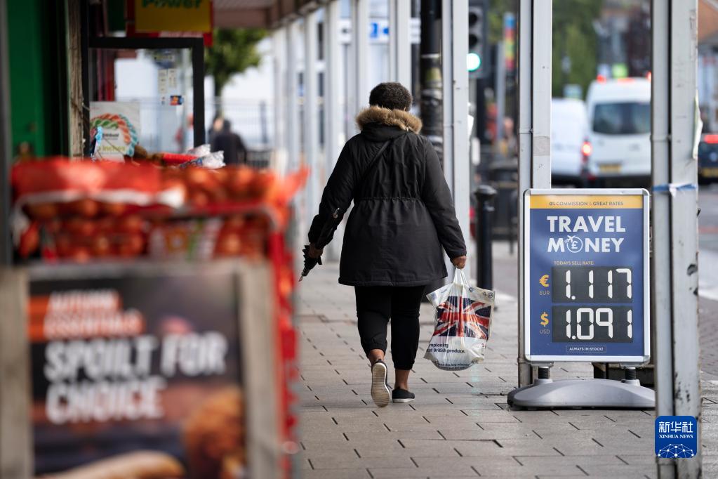 10月7日,在英國曼徹斯特,一名女子走過(guò)一處貨幣兌換點(diǎn)。