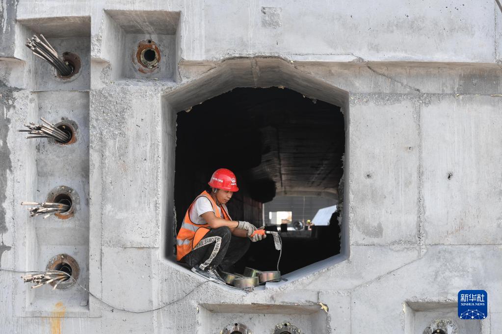 10月8日,施工人員在中山智慧梁場(chǎng)的第155片60米混凝土箱梁上進(jìn)行隔墻作業(yè)。新華社記者 劉大偉 攝