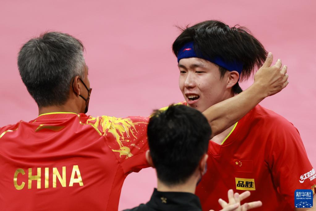10月8日,中國隊選手王楚欽(右)在獲勝后與教練秦志戩慶祝,他以3比0戰勝日本隊選手戶(hù)上隼輔。