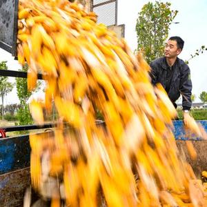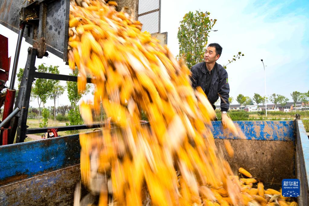 10月8日,河南省濟源市梨林鎮農民在田間收獲玉米。當日是寒露節氣,各地農民搶抓農時(shí)忙碌在田間地頭。新華社發(fā)(苗秋鬧 攝)