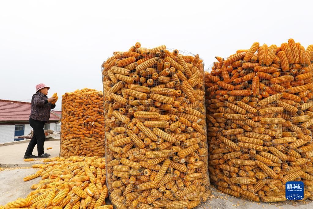 10月8日,在河北省唐山市豐潤區楊官林鎮破寺村,農民將收獲的玉米封囤歸倉。新華社發(fā)(朱大勇 攝)