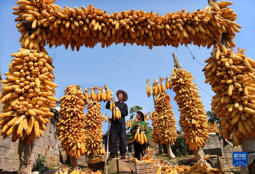 10月8日,山東省淄博市沂源縣西里鎮欣苗村農民在晾曬收獲的玉米。新華社發(fā)(趙東山 攝)