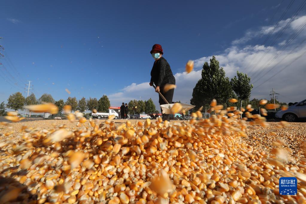 10月9日,河南省焦作市溫縣黃河街道張王莊村農民在晾曬玉米。