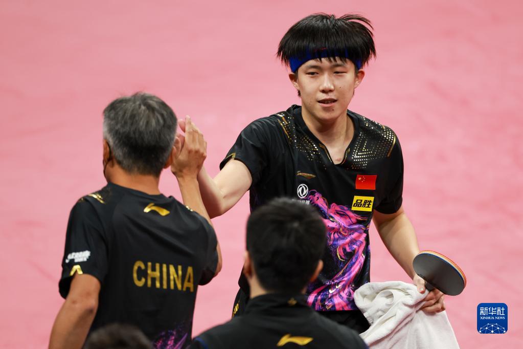 10月9日,中國隊選手王楚欽(右)在獲勝后與教練秦志戩擊掌,他以3比0戰勝德國隊選手凱·斯達姆珀。新華社記者 胥冰潔 攝