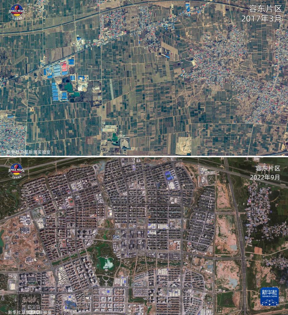 拼版照片:上圖為2017年3月的雄安新區容東片區衛星圖;下圖為2022年9月的雄安新區容東片區衛星圖。