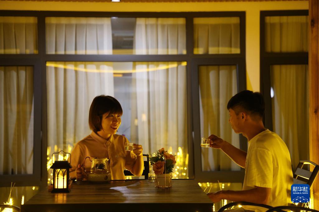 2022年9月6日,在雄安新區經(jīng)營(yíng)民宿的雄安人韓星(左)在和客人交流。