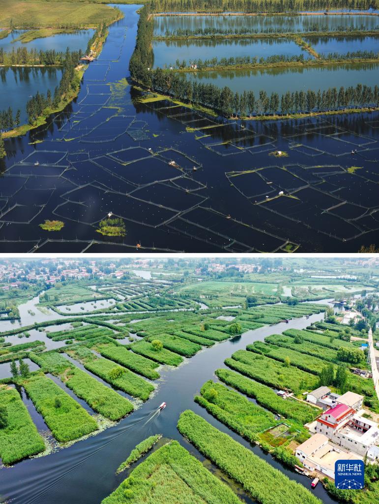 拼版照片:上圖為2012年9月29日拍攝的白洋淀(金潔 攝);下圖為2021年8月14日拍攝的白洋淀風(fēng)光(無(wú)人機照片,新華社記者牟宇攝)。