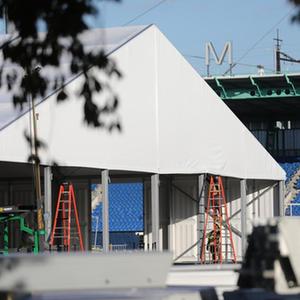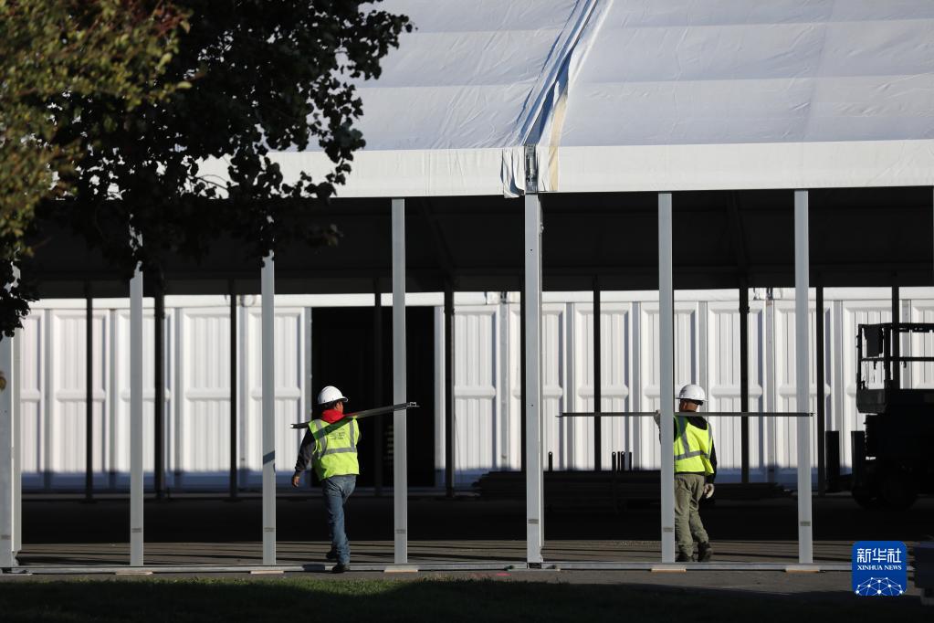 10月9日,工人在位于美國紐約市蘭德?tīng)枍u的移民救援中心建設工地工作。