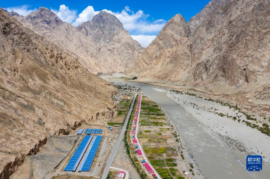通往縣城的公路從新疆塔什庫爾干塔吉克自治縣大同鄉的一處易地扶貧搬遷安置點(diǎn)旁穿過(guò)(2020年6月14日攝,無(wú)人機照片)。