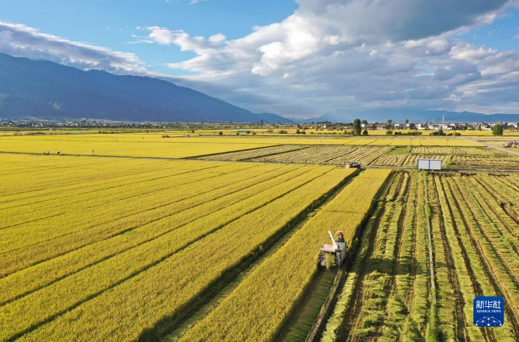 10月8日,在云南省大理白族自治州大理市灣橋鎮,農機手在收獲水稻(無(wú)人機照片)。