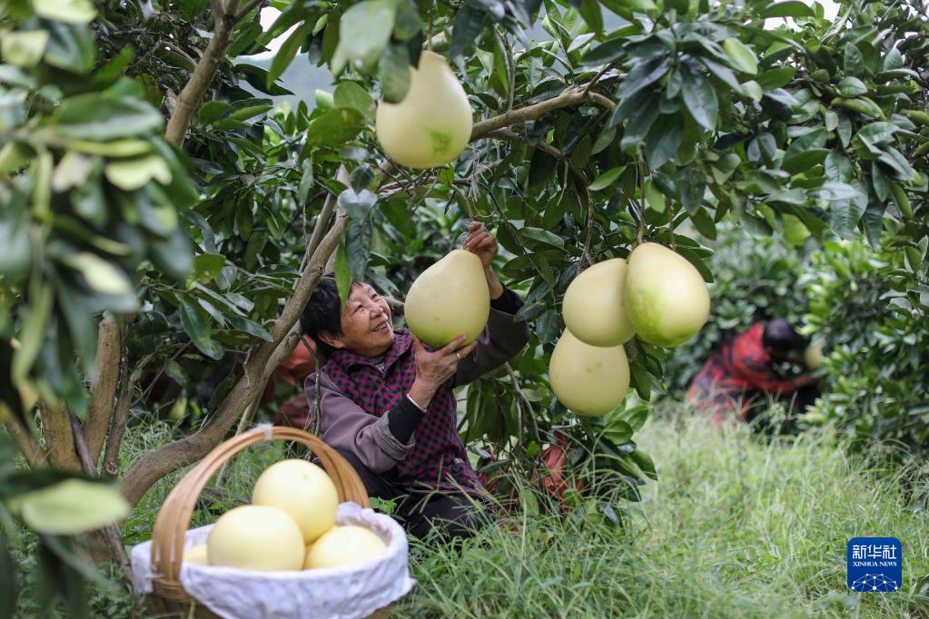 10月10日,果農在貴州省遵義市綏陽(yáng)縣風(fēng)華鎮雙龍村采收柚子。
