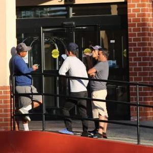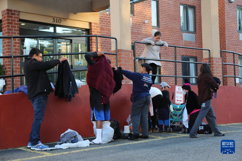 10月9日,安東尼奧·奧萬(wàn)多(左一)在美國紐約市斯塔滕島“舒適”旅館前挑選適合家人的衣服。