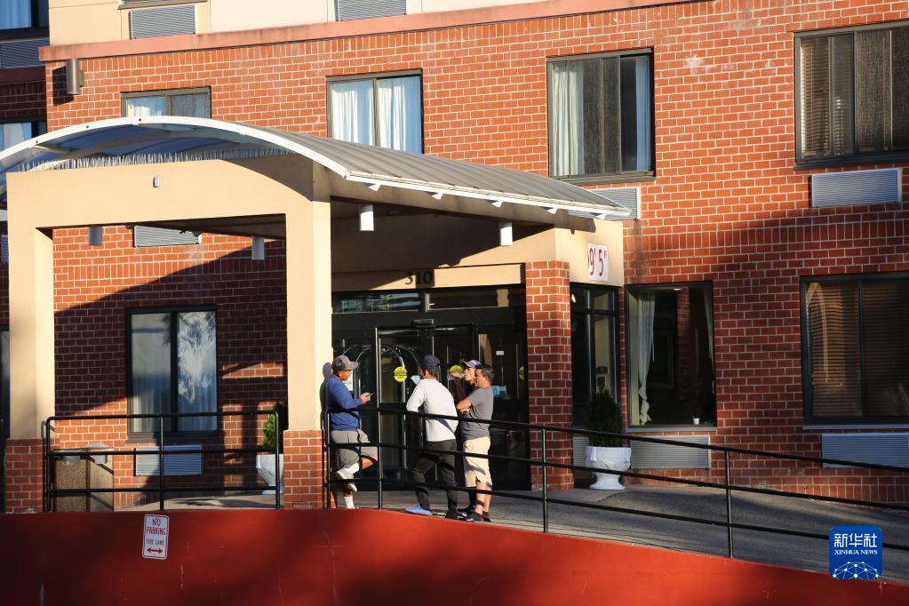 10月9日,尋求庇護者在美國紐約市斯塔滕島“舒適”旅館外等待當地居民送來(lái)衣物等用品。