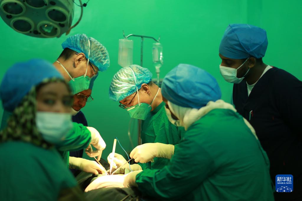 8月8日,在蘇丹喀土穆恩圖曼友誼醫院,中國醫療隊隊員與當地醫務(wù)人員為患者實(shí)施手術(shù)。