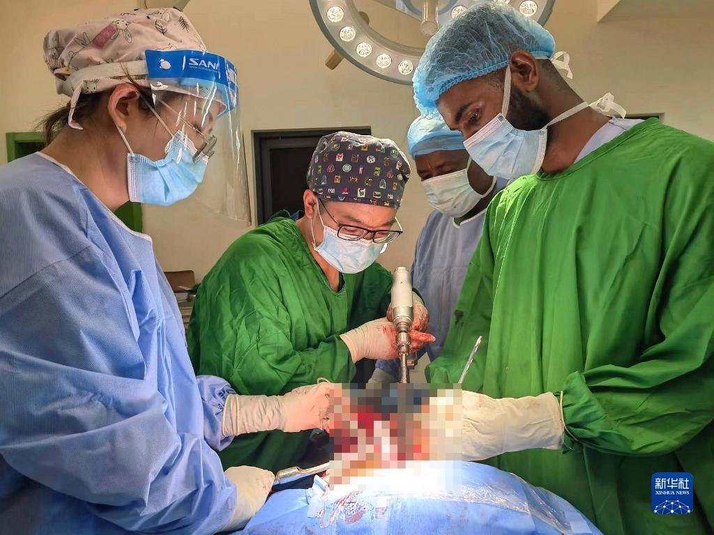 9月19日,在蘇丹杰濟拉州哈薩海薩市阿布歐舍鎮的阿布歐舍友誼醫院,中國醫療隊隊員與當地醫務(wù)人員為患者實(shí)施手術(shù)。