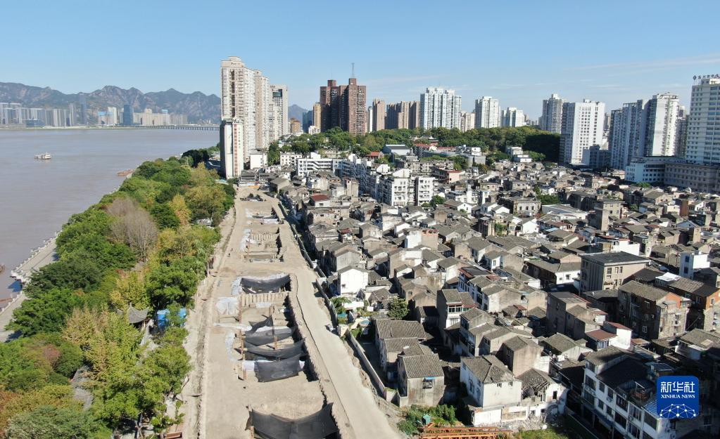 鳥(niǎo)瞰甌江邊的朔門(mén)古港考古發(fā)掘現場(chǎng)(10月10日攝,無(wú)人機照片)。