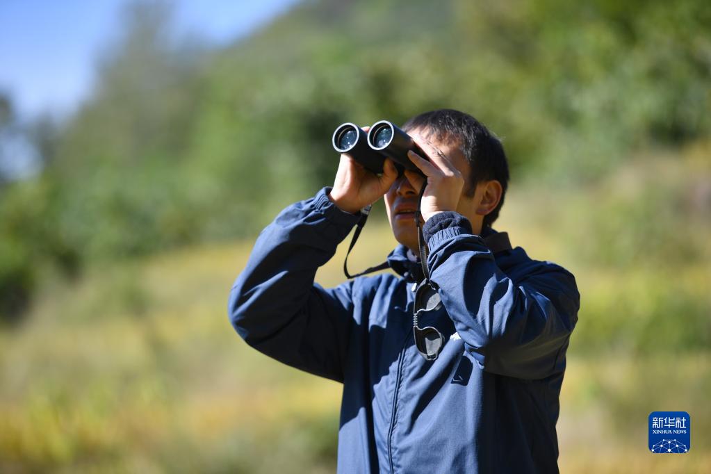 陜西寧陜朱鹮野化放飛基地管理站站長(cháng)李夏在觀(guān)察朱鹮的日常狀況(10月10日攝)。 新華社記者邵瑞攝