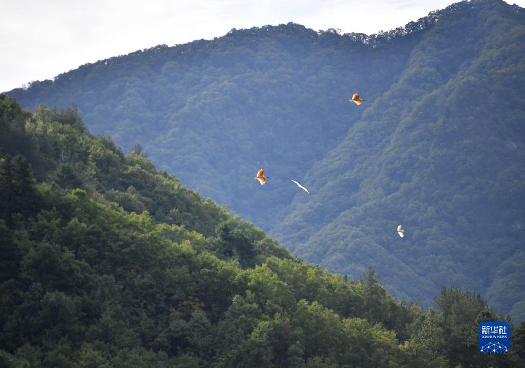 寧陜縣城關(guān)鎮寨溝村,朱鹮在天空中翱翔(10月10日攝)。 新華社記者邵瑞攝