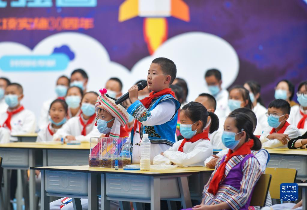 10月12日,在云南省大理新世紀中學(xué),收看“天宮課堂”第三課的學(xué)生介紹地面種植的擬南芥生長(cháng)情況。 新華社記者 陳欣波 攝