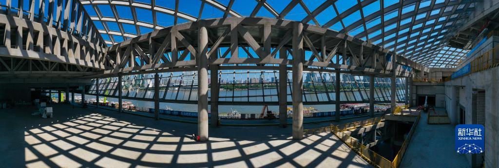 廣東美術(shù)館、廣東非物質(zhì)文化遺產(chǎn)展示中心、廣東文學(xué)館“三館合一”的鋼結構連廊形成美妙的光影空間(10月12日攝,無(wú)人機全景照片)。