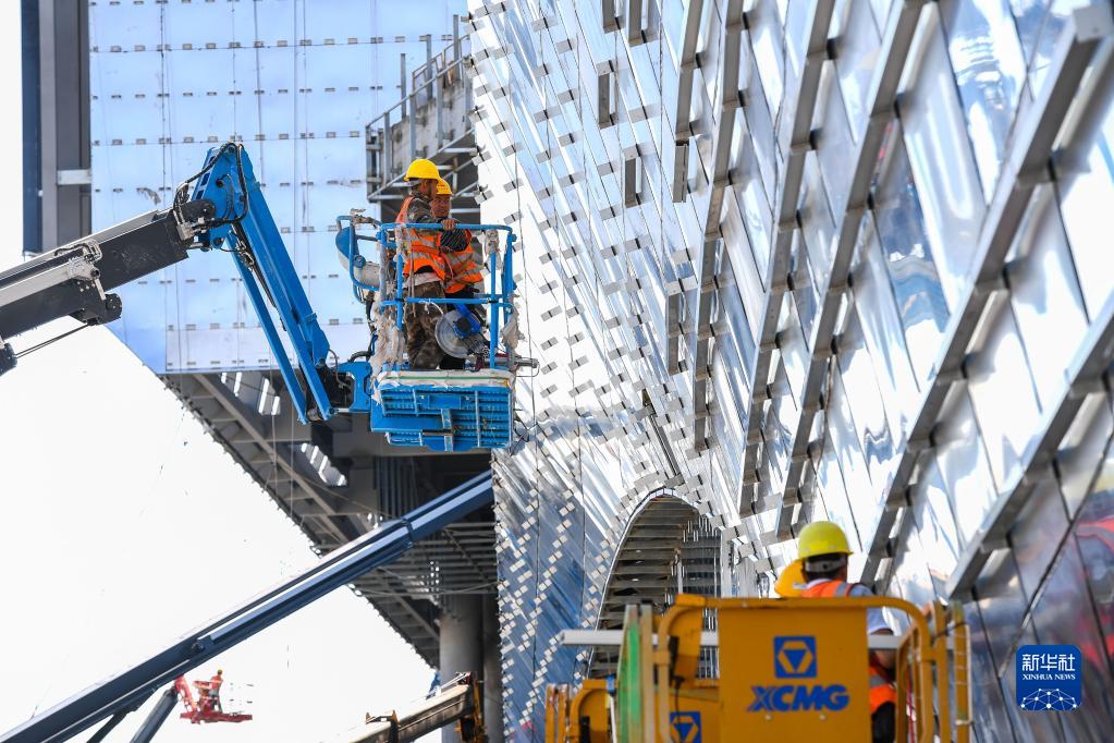 建設者在廣東美術(shù)館、廣東非物質(zhì)文化遺產(chǎn)展示中心、廣東文學(xué)館“三館合一”項目進(jìn)行幕墻施工(10月12日攝)。