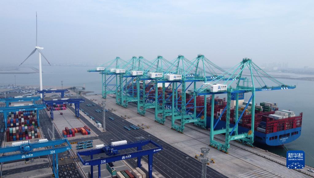 10月13日,“中遠海運天秤座”貨輪??吭谔旖蚋郾苯蹍^C段智能化集裝箱碼頭進(jìn)行裝卸作業(yè)(無(wú)人機照片)。 新華社記者 趙子碩 攝