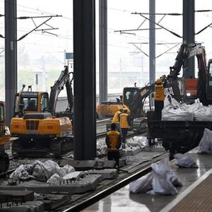 10月14日,施工者在天津西站操作機械設備進(jìn)行換枕作業(yè)。