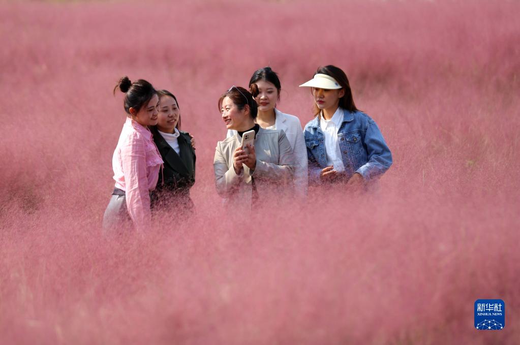 10月8日,在山東省臨沂市沂南縣岸堤鎮朱家林村,游客在粉黛亂子草中拍照游玩。