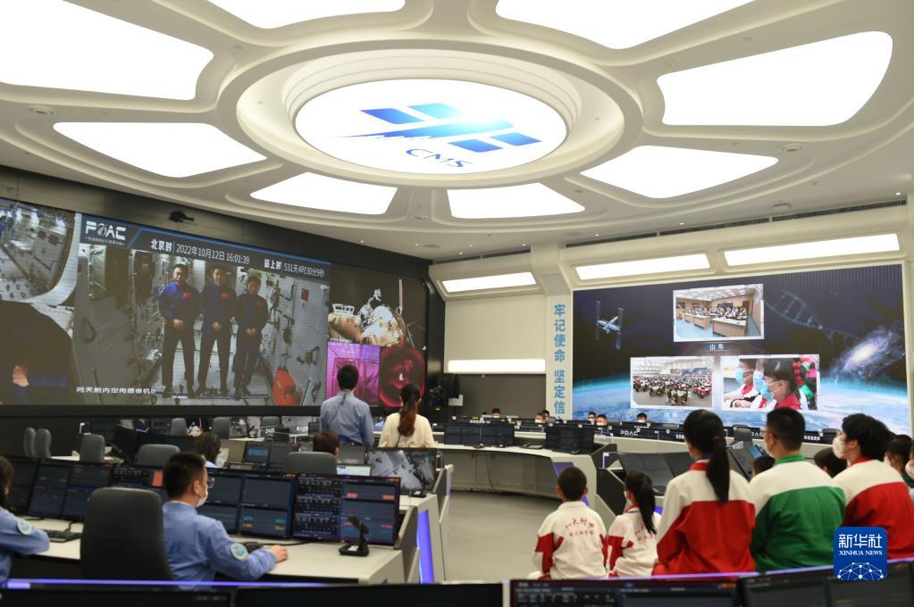10月12日,在中科院空間應用工程與技術(shù)中心地面主課堂,學(xué)生收看“天宮課堂”第三課。