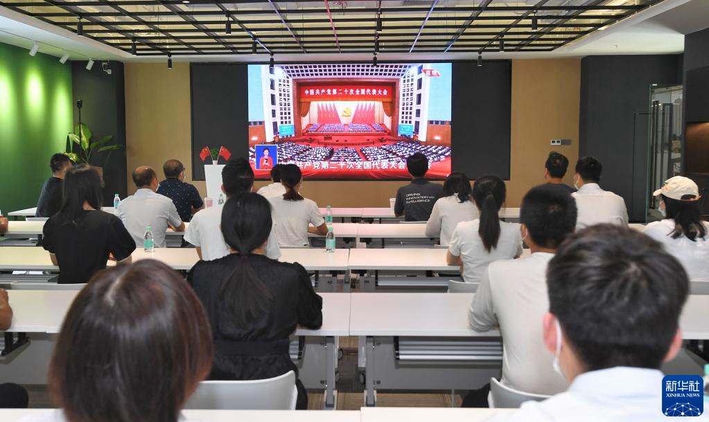 10月16日,在廣東省深圳市前海深港青年夢(mèng)工場(chǎng)北區,在前海工作的青年收看中國共產(chǎn)黨第二十次全國代表大會(huì )開(kāi)幕會(huì )。