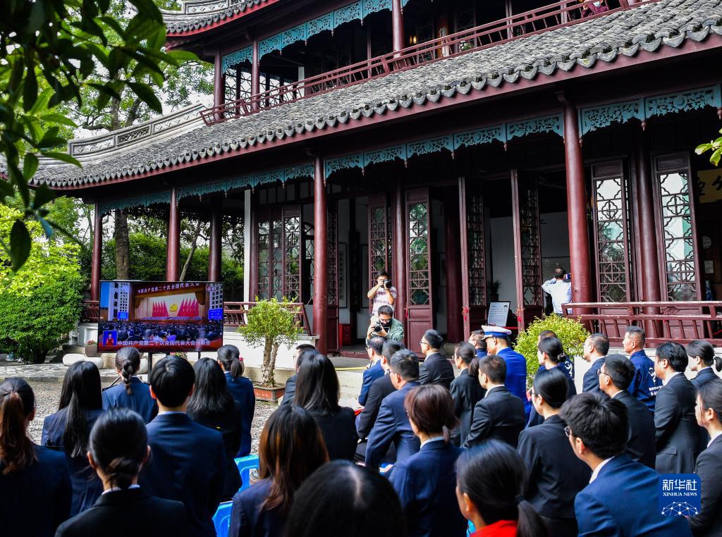 10月16日,浙江嘉興南湖區的黨員在南湖湖心島收看中國共產(chǎn)黨第二十次全國代表大會(huì )開(kāi)幕會(huì )。