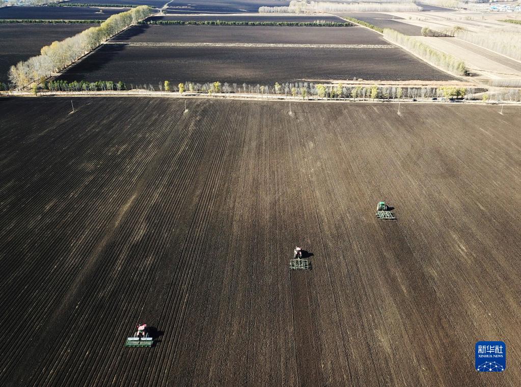 10月15日,在黑龍江省拜泉縣興華鄉順利村,農機在進(jìn)行大壟整地(無(wú)人機照片)。