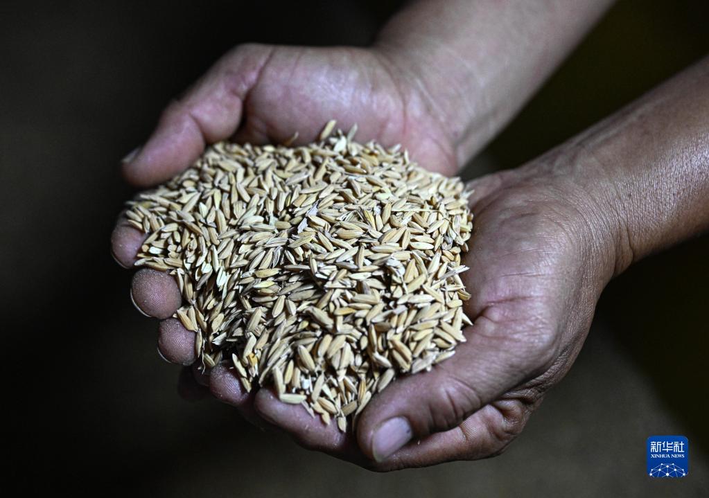 10月15日,工人在位于海南省東方市的海南農樂(lè )南繁科技有限公司展示水稻種子。新華社記者 蒲曉旭 攝