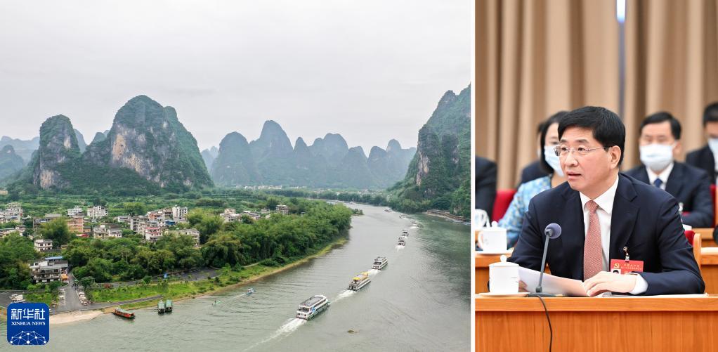 拼版照片:右圖為黨的二十大代表周家斌在廣西代表團討論中發(fā)言(新華社記者謝環(huán)馳2022年10月17日攝);左圖為漓江廣西陽(yáng)朔段(新華社記者曹祎銘2021年4月25日攝)。