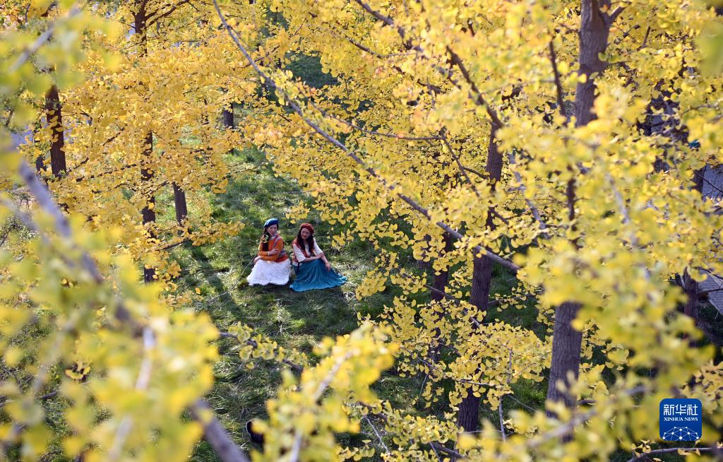 近日,古城西安市雁塔區雁南公園里秋色正濃,吸引游客賞景游玩。