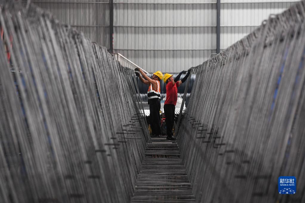 10月18日,工人在黃茅??绾Mǖ乐腔哿簣?chǎng)綁扎預制箱梁鋼筋籠。