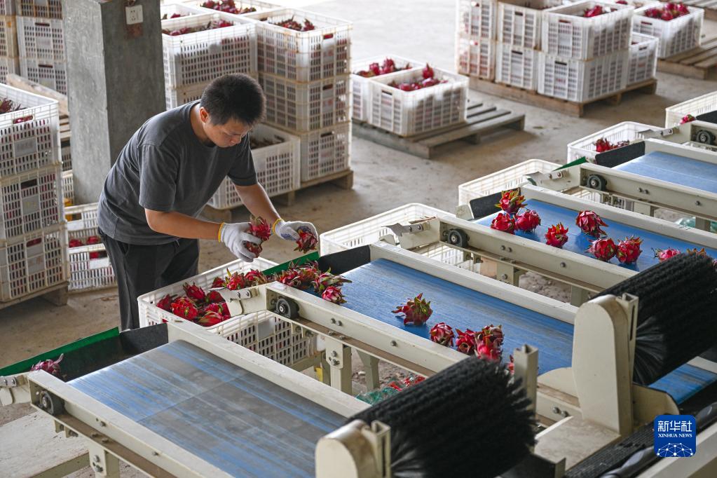 10月17日,工人在海南省東方市的一處火龍果基地分選火龍果。