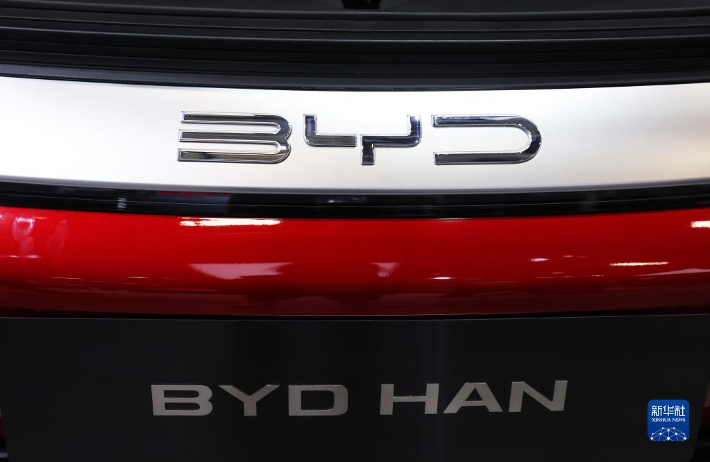 這是10月18日在法國巴黎國際車(chē)展上拍攝的比亞迪漢的標識。