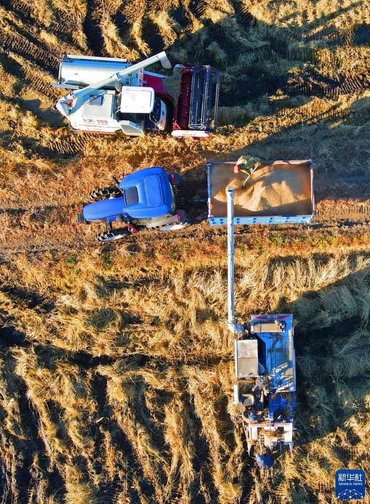 10月18日,在遼寧沈陽(yáng)市沈北新區興隆臺鎮青年農場(chǎng),農民把機械化收割下來(lái)的水稻裝車(chē)(無(wú)人機照片)。