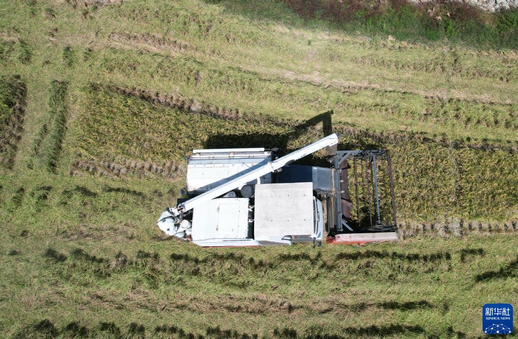 10月19日,在廣西柳州市融安縣浮石鎮長(cháng)龍村,農民駕駛收割機收割晚稻(無(wú)人機照片)。