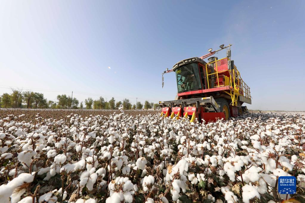 在新疆巴音郭楞蒙古自治州尉犁縣興平鎮巴西阿瓦提村的一塊棉田里,國產(chǎn)采棉機在采收棉花(10月14日攝)。