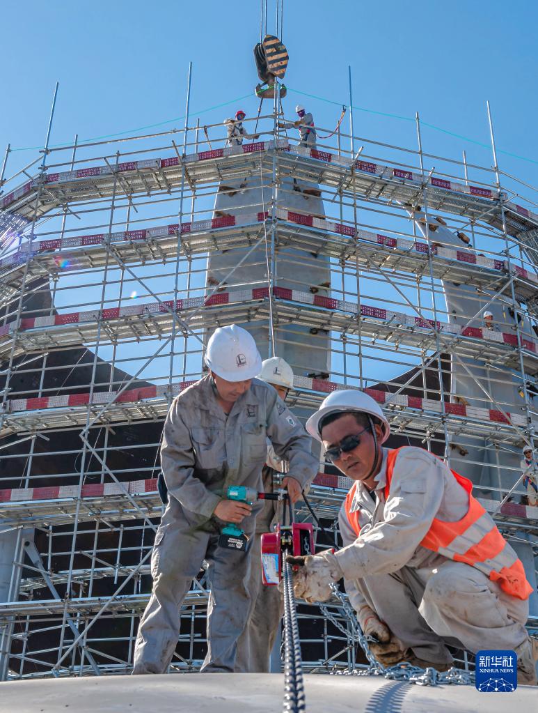 在中石化天津南港乙烯項目建設現場(chǎng),施工人員在固定鋼板(9月9日攝)。