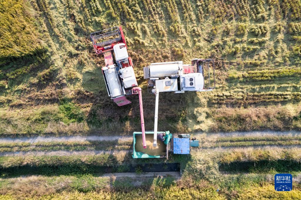10月20日,在湖南省常德市鼎城區謝家鋪鎮,收割機把收好的稻谷轉放到運輸車(chē)里(無(wú)人機照片)。