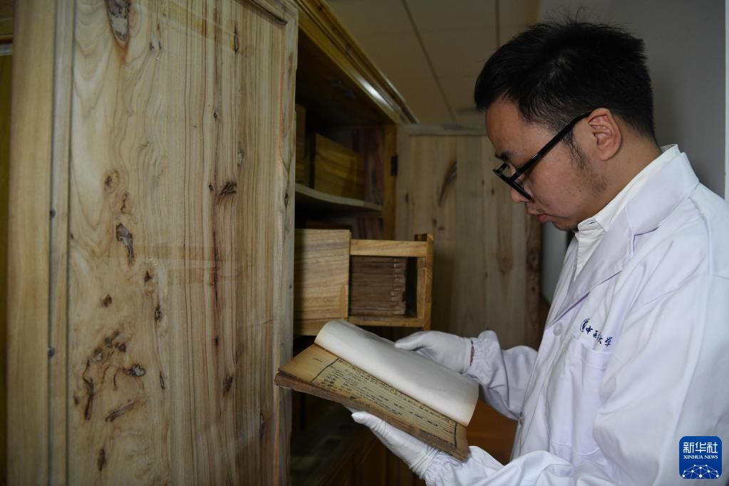 10月20日,安徽中醫藥大學(xué)圖書(shū)館古籍部主任鄧勇查看中醫古籍。