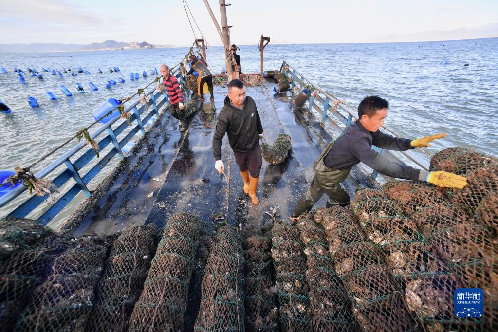 在福建省霞浦縣三沙鎮海域,采蠔工轉運采收的生蠔(10月22日攝)。