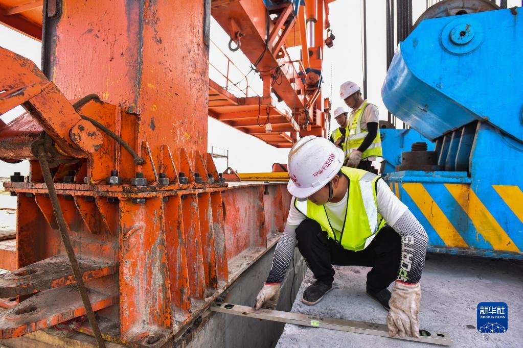 10月25日,施工人員在增江特大橋架梁現場(chǎng)輔助架橋機調整精度。